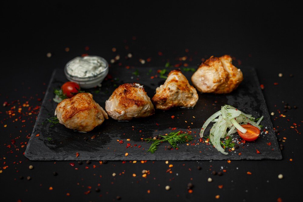 Шашлык из куриного филе бедра (300 г.) Подается с луком, зеленью и лавашом